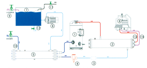 1、壓縮機 2、殼管式冷凝器 3、干燥過濾器 4、熱力膨脹閥 5、干式蒸發器 6、不銹鋼水泵 7、水箱